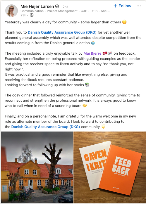 ”Endnu en gang tak for en virkeligt god og lærerig formiddag med dig. Jeg har fået mange positive tilbagemeldinger allerede. Vi vil følge op på dagen og drøfte, hvordan vi kan arbejde videre med vores feedback-kultur.”